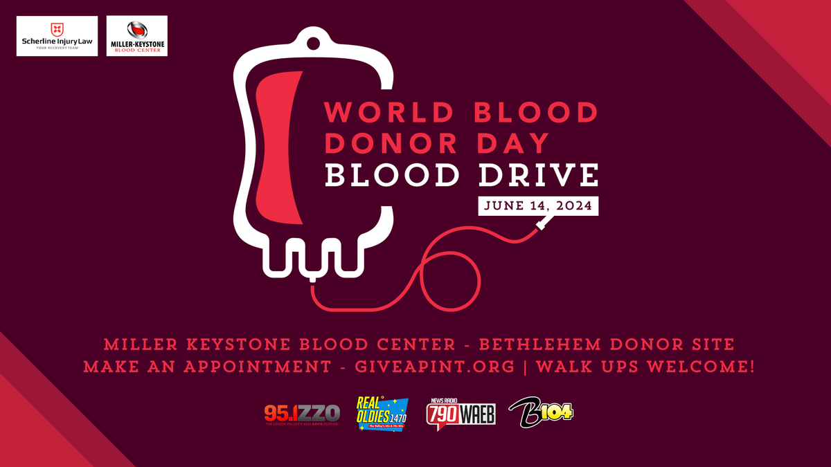 Join B104, 95-1 ZZO, Real Oldies 1470 and NewsRadio 790 WAEB at the Miller Keystone Blood Center in Bethlehem as we celebrate WORLD BLOOD DONOR DAY, sponsored by: Scherline Injury Law!