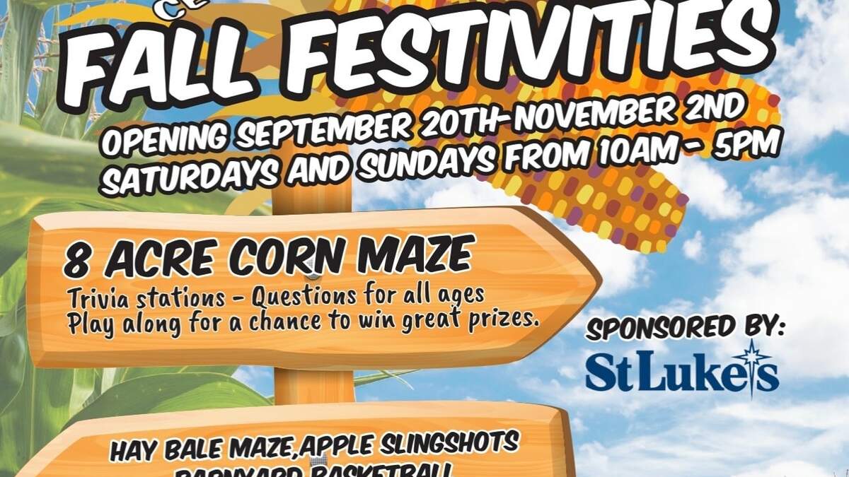 Friday night's are special Flash Light Corn Maze events from 6pm-9pm! They are also open Saturdays and Sundays 10AM-5PM until November 2nd. Experience a perfect fall day of FARM FRESH FUN for the entire family! Lots of new barnyard games and attractions, all included in our regular admission. Shop our farm store for apples, cider, pumpkins, straw bales, and corn stalks. Grab a hot dog and slushie and enjoy it in our new covered picnic area.
